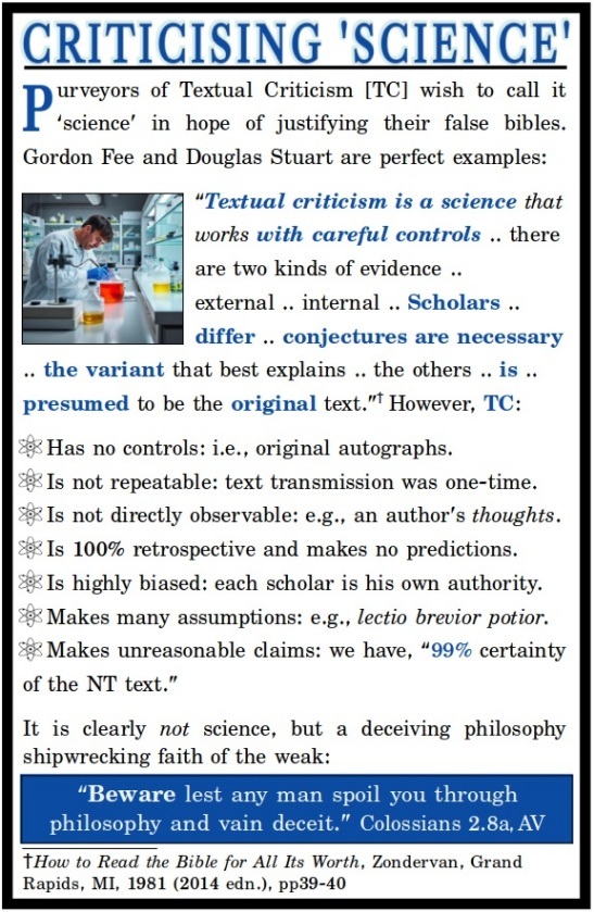| Criticising 'Science' | Modern scholars love to label Textual Criticism a 'science' to boost all the false bibles they recommend. | 20250620-Criticising 'Science'.jpg | 20250620 |