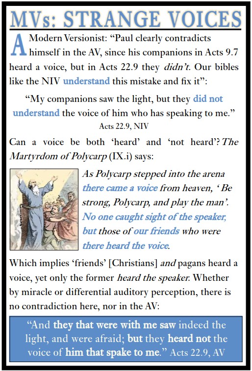 | MVs: Strange Voices | The Modern Versionist charges Acts 22.9 with a contraction, but the story of Polycarp shows the same thing. | 20251017-MVs_Strange Voices.jpg | 20251017 |