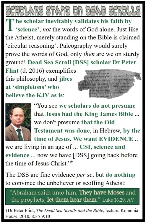 | Scholars Stand on Dead Scrolls | Dead Sea scholars like Dr Peter Flint place the 'science' of paleography above scripture, and imply those who simply believe the preserved Bible today like the AV are on unsafe ground. | 20260418-Scholars Stand on Dead Scrolls.jpg | 20260418 |